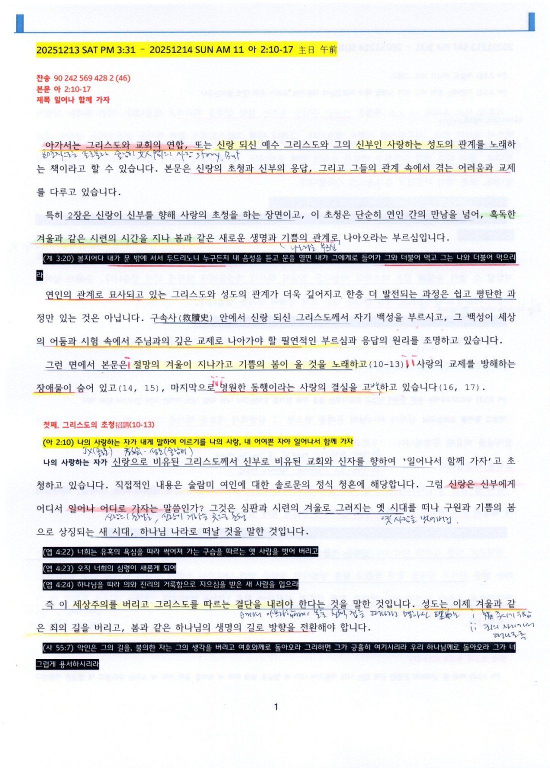 (아 2:10) 나의 사랑하는 자가 내게 말하여 이르기를 나의 사랑, 내 어여쁜 자야 일어나서 함께 가자