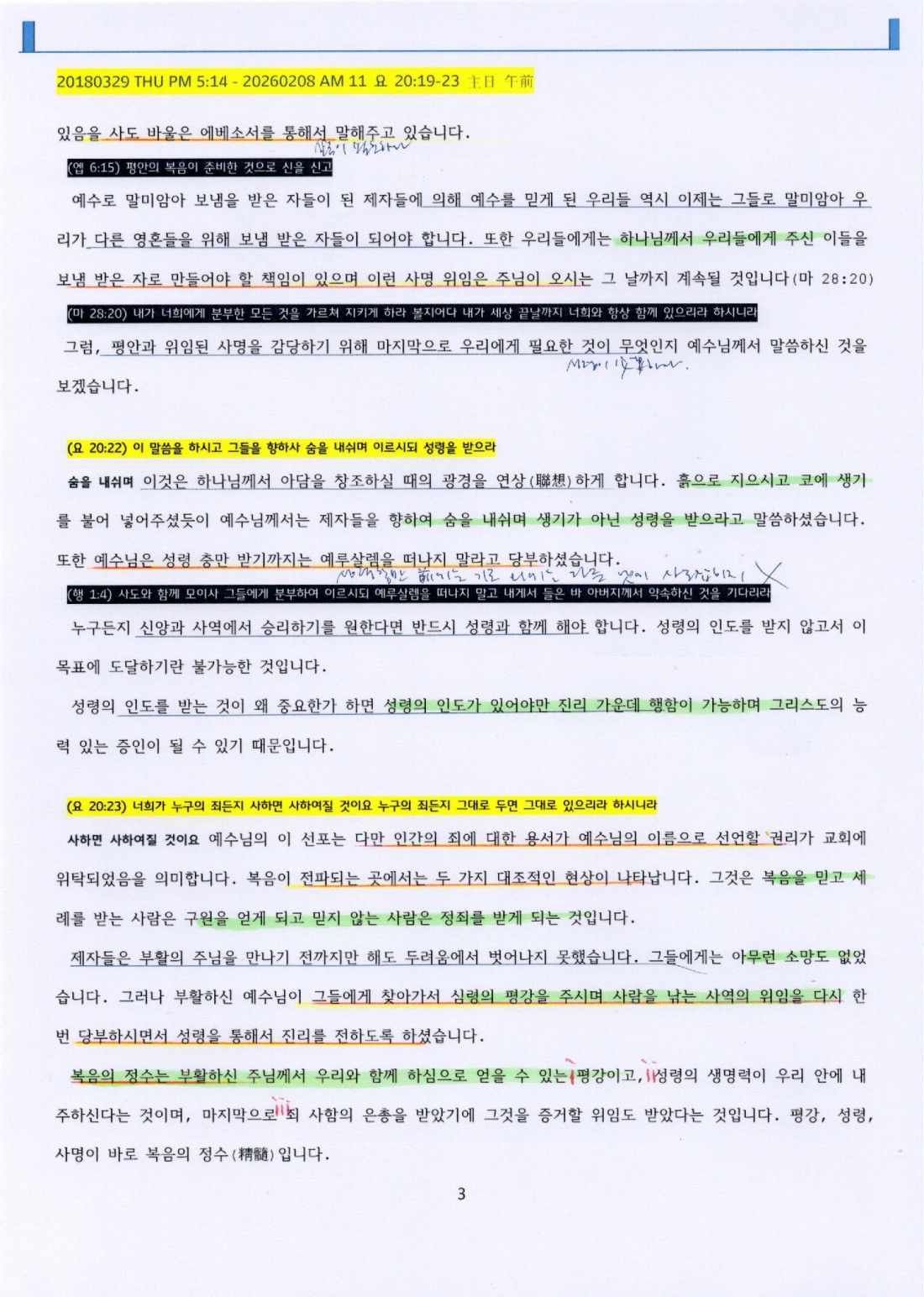 (요 20:22) 이 말씀을 하시고 그들을 향하사 숨을 내쉬며 이르시되 성령을 받으라